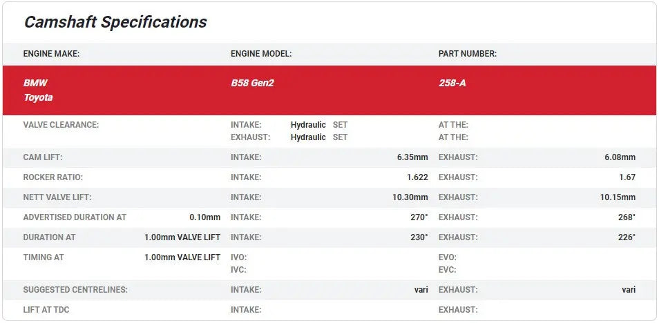258-A - 270'/268' | Stage 1: Stage 1 cams for engine with bolt on intake, exhaust and turbo upgrades. For an engine producing around 550-750hp running a 58-68mm turbo.